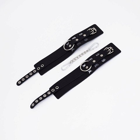 Изделие выполнено из мягких кожаных ремешков , которые комфортно облегают запястья или щиколотки, обеспечивая удобство даже при длительном использовании. Треугольная цепь плетения добавляет изделию элегантности и эротичности, подчеркивая красоту вашего тела. Минималистичный дизайн позволяет использовать их не только для фиксации в любовных играх, но и как стильный аксессуар, который украсит ваш повседневный или вечерний образ.