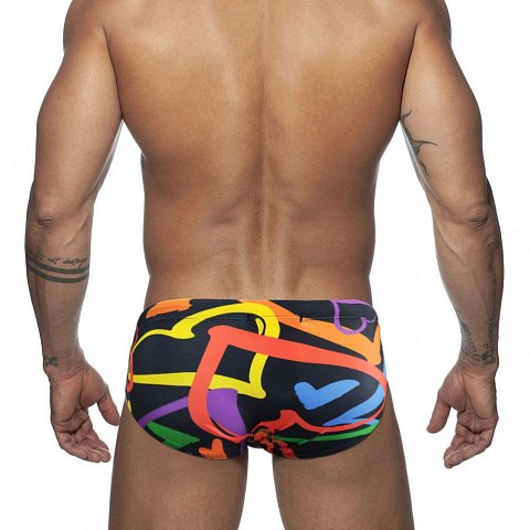 Черные мужские плавки с принтом в виде крупных разноцветных сердец