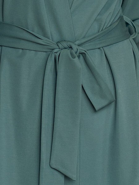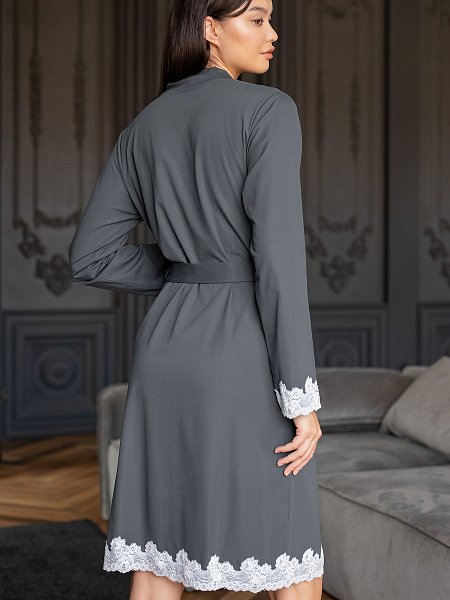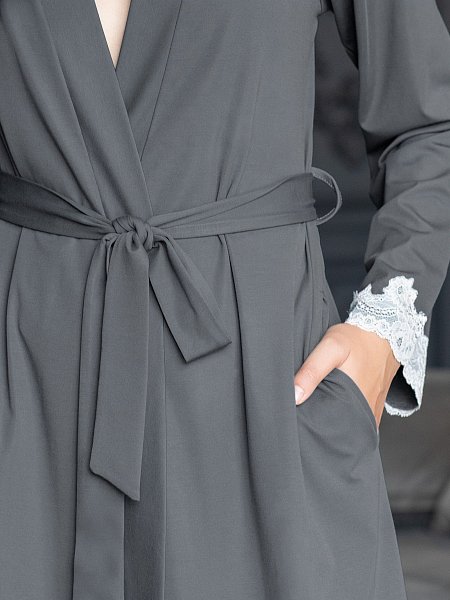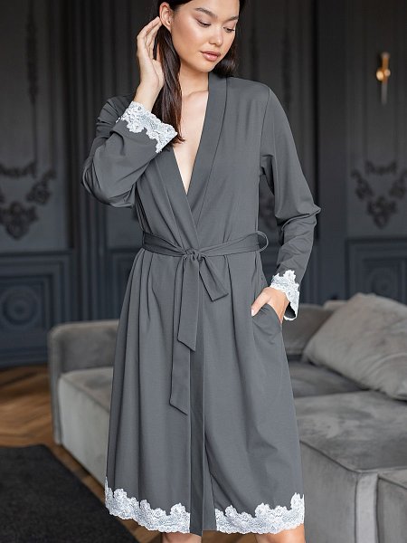 Женский домашний халат из роскошной приятной к телу ткани, содержащей вискозу и тенсел. Универсальная длина миди и модель на «запАх» подойдет всем. Халат поддерживается поясом и внутренней завязкой. По подолу и низу рукавов украшен ажурной кружевной аппликацией молочного цвета.