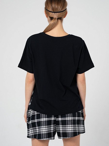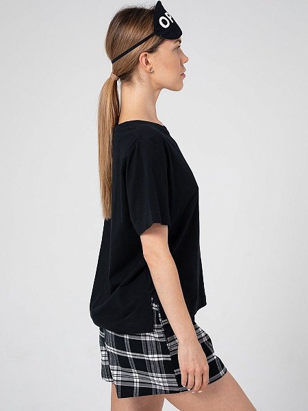 Набор для сна и отдыха: футболка, шорты, маска. Очаровательные шортики из мягкой фланели, с удобными боковыми карманами. Широкий пояс на резинке, дублированный кулиской с принтованной тесьмой. Футболка свободного кроя из хлопкового трикотажа, с женственным круглым вырезом, с коротким рукавом. Небольшого размера логотип на груди придает свежий акцент. Мягкая хлопковая маска – необходимый атрибут для сна. В комплекте: футболка, шорты, маска.