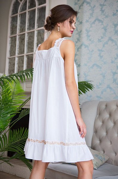 Сорочка средней длины свободного силуэта на широких бретелях выполнена из хлопка. Декором сорочки является вышивка расположенная на кокетке и бретелях. По горловине проходит узкая рюша. Низ кокетки подчеркнут кружевом. По полочке проходит функциональная планка с перламутровыми пуговицами. Спинка на кокетке, нижняя часть спинки со сборкой. По низу сорочки расположена рюша с декором из ленты с вышивкой.