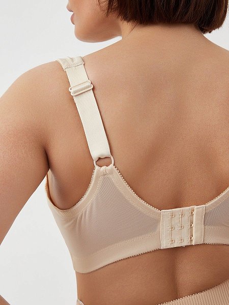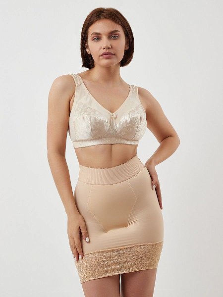 Бюстгальтер бескостный, полностью закрывающий грудь, Т-образная чашка для хорошей посадки, на широком поясе для комфортной поддержки, в боковинах пояса вставлены косточки, чтобы создать красивый силуэт в подмышечной впадине, застежка на четыре крючка в три ряда, бретели широкие с дополнительным кроем на плече, чтоб не натирать и продавливать под весом груди, регулируемые. Ткань гладкая и шелковистая.
