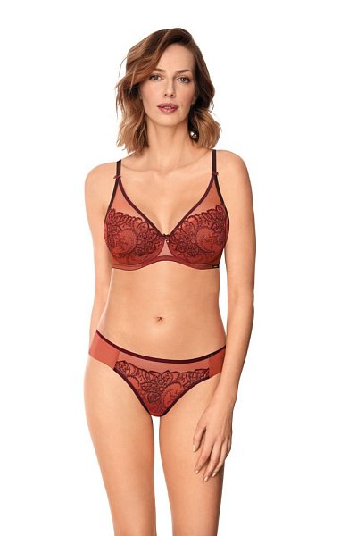 Бюстгальтер Livia с шитыми чашками из тонкого поролона, на косточках, с дополнительными боковыми поддержками, со съёмными вкладышами пуш-ап. Внутренняя сторона проложена хлопковым трикотажем, внешняя из сетки с вышивкой. Бретельки отстёгиваются, регулируются по длине. На спине застёжка на удлинитель, количество крючков в ряду застёжки увеличивается пропорционально размеру бюстгальтера.