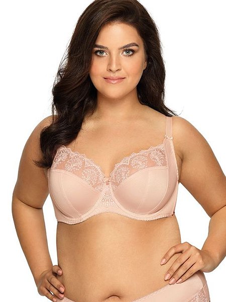 Бюстгальтер на косточках, с дополнительными боковыми поддержками, чашки мягкие, шитые из гладкого трикотажа, верхняя часть чашки из сетки с вышивкой, бретельки не отстёгиваются, регулируются. На спине застёжка на удлинитель.