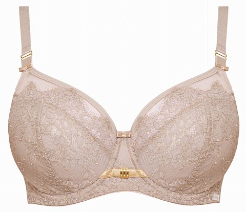 Бюстгальтер на косточках, с дополнительными боковыми поддержками, чашки мягкие, шитые из кружева с гипюром , верх чашки из сетки, бретельки не отстёгиваются, регулируются по длине. На спине застёжка на удлинитель, количество крючков в ряду застёжки увеличивается пропорционально размеру бюстгальтера. Материал: 60% PA, 16% PE, 10% CO, 7% EA, другие 7%