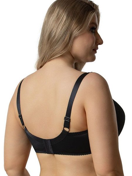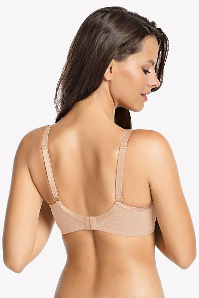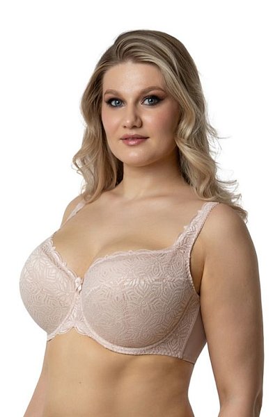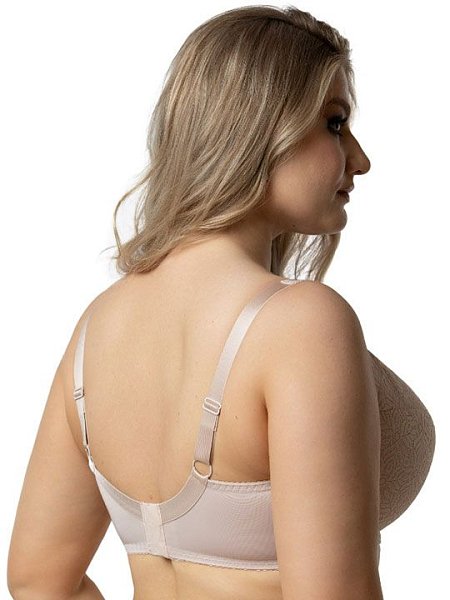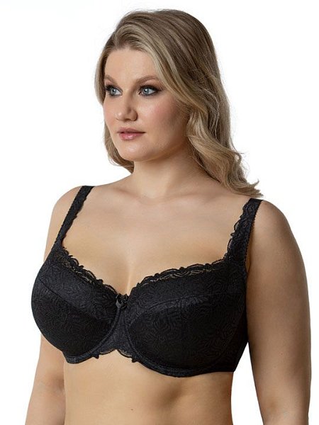 Бюстгальтер на каркасах с дублированной чашкой. Чашки овальной формы с диагональным членением создают округлую наполненную форму. Кружевная верхней детали чашки шире дублированного основания, что в сочетании с широкой кружевной отделкой бретели позволяет сгладить линию перехода от верха чашки к открытому участку груди и с делать бюстгальтер более незаметным под облегающей одеждой. Широкий стан с боковыми упругими пластинами плотно облегает тело и обеспечивает стабильную комфортную посадку бюстгальтера на фигуре.