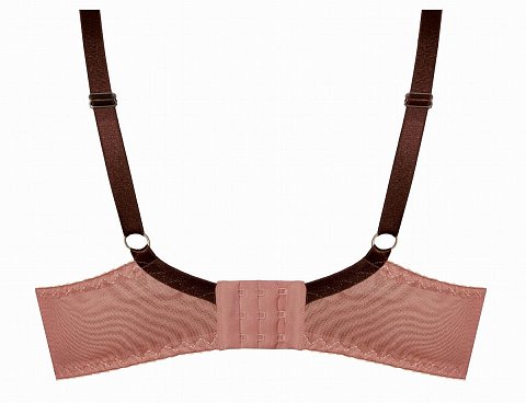 Бюстгальтер Zoe на косточках, с дополнительными боковыми поддержками, чашки шитые, на тонком поролоне, со съёмными пуш-ап вкладышами, внутренняя сторона проложена хлопковым трикотажем, внешняя сторона чашек из кружева. Бретельки бордового цвета несъёмные, регулируются по длине. На спине застёжка на удлинитель, количество крючков в ряду застёжки, увеличивается пропорционально размеру бюстгальтера.