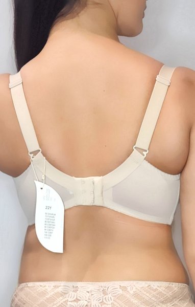 Бюстгальтер A-221 M выполнен на основе бюста 1003 с мягкими чашками на косточках, с дополнительными боковыми поддержками, чашки шитые из неэластичной сетки, снаружи по типу топа покрыты гипюром с цветочным рисунком и геометрическим рисунком с золотым люрексом, спинка из стабилизирующей сетки, Бретельки регулируются по длине, не отстёгиваются, на спине застежка-удлинитель, слайдер в форме сердца, фурнитура металлическая крашеная.