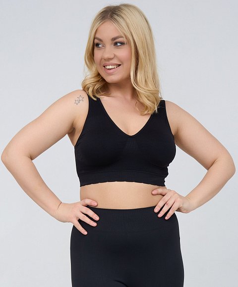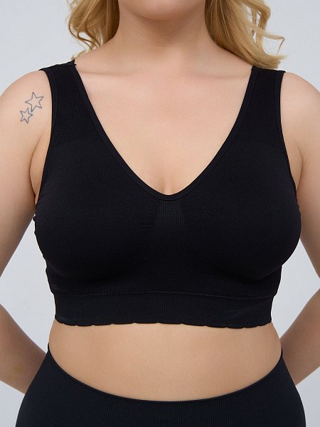Гладкий бюстгальтер-топ, с подкроем для комфортного удержания груди, широкие бретели, формованные вставки вынимаются, очень комфортный, микрофибра, V-образный вырез делает фигуру зрительно стройнее.