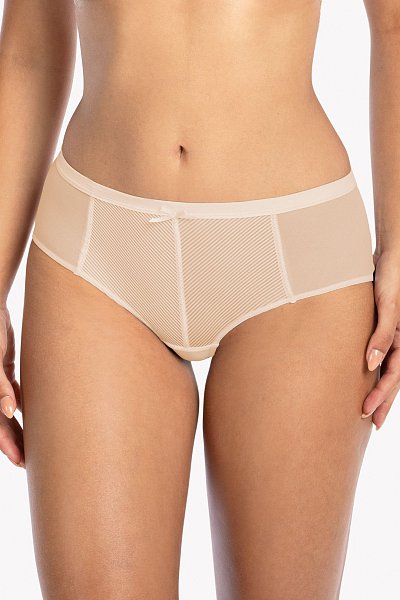 Трусики-слипы Sonia выполнены из эластичной полосатого трикотажа и сетки, на спинке вставки из сетки, сложенной вдвое. Ластовица проложена 100% хлопком.